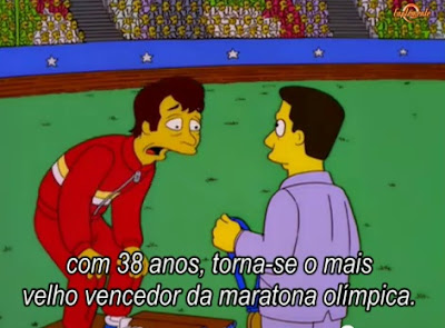Homer Simpson está deitado no sofá à frente da televisão, a ver um programa sobre os grandes feitos na história dos Jogos Olímpicos. No terceiro e último exemplo de heroísmo, surge o nome de Carlos Lopes, com mais um ano do que devia.- E em 1984, o português Carlos Lopes tornou-se o mais velho corredor da maratona de sempre, com 38 anos